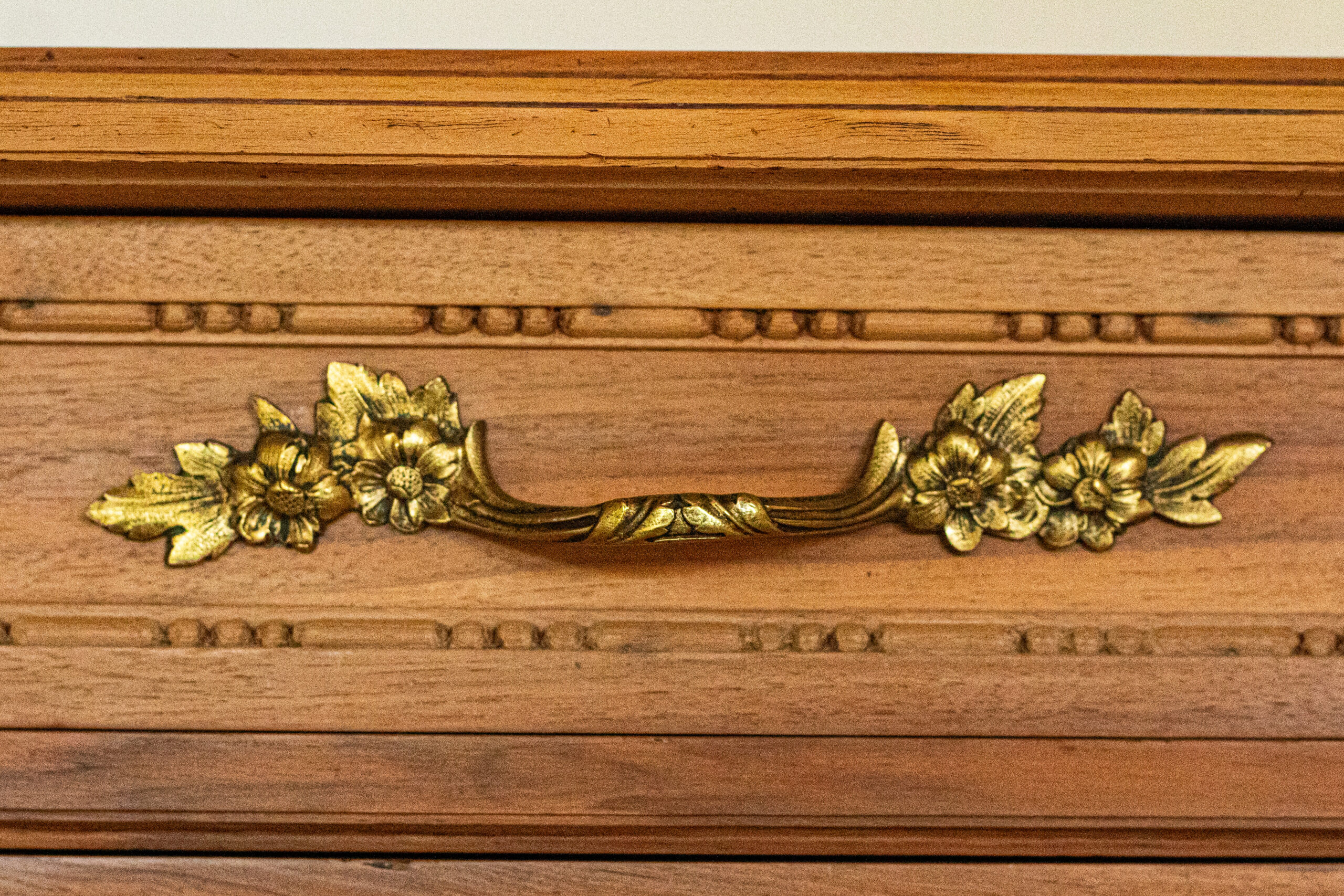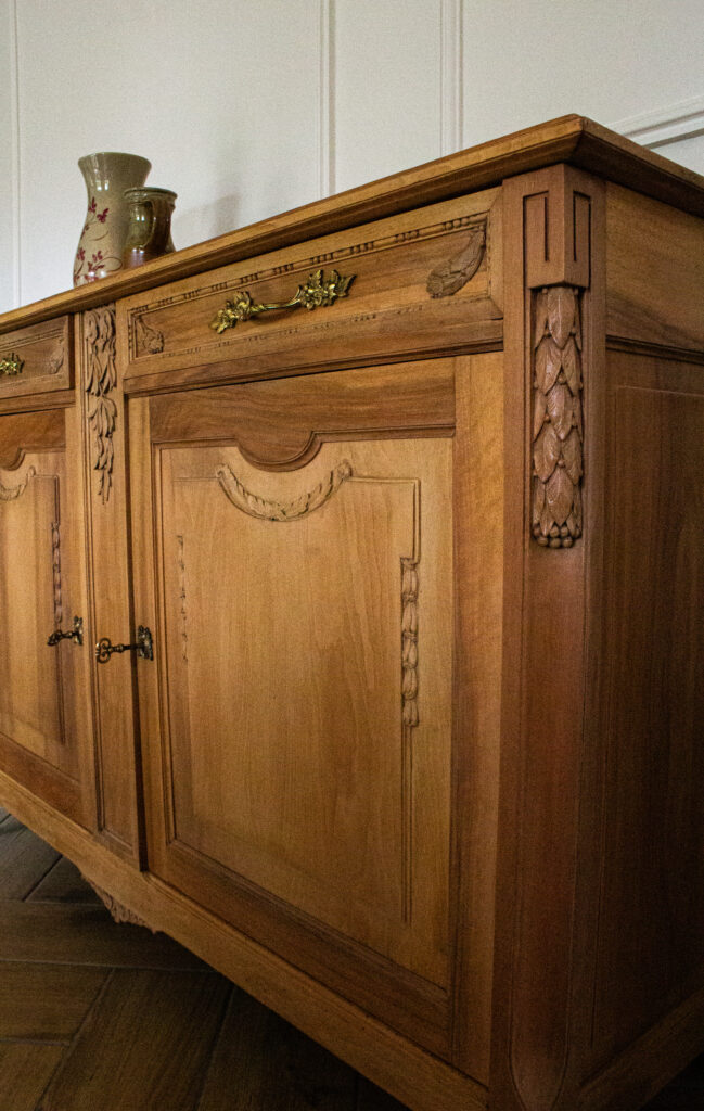 Le résultat : un buffet qui a retrouvé sa noblesse de meuble traditionnel. Chaque moulure, chaque fleur du plastron raconte désormais l’histoire d’une double patience – celle de l’artisan du 19ème, et celle de sa renaissance contemporaine