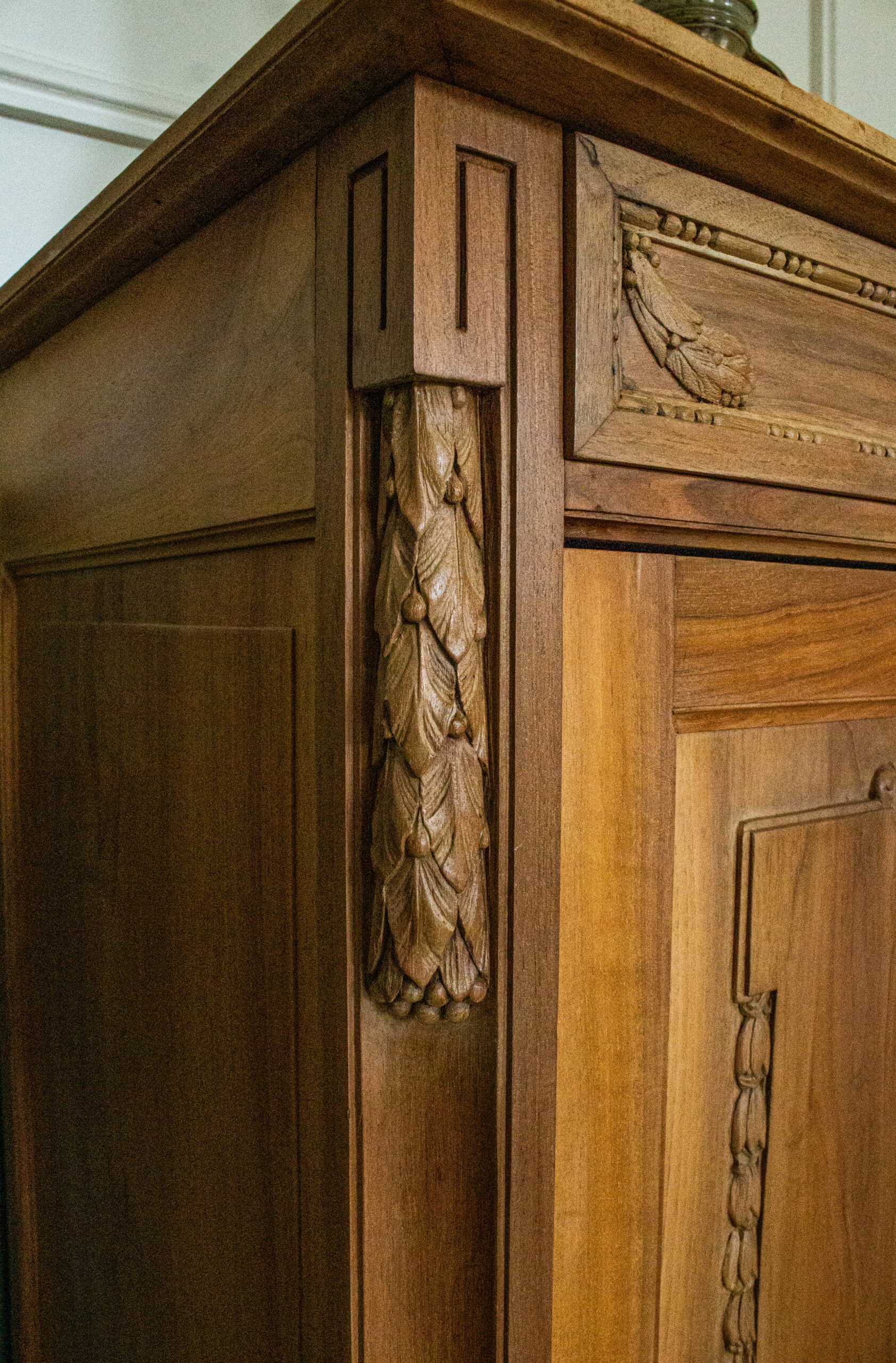 exigeait une attention méticuleuse. Le bois bicolore, libéré de sa gangue de crasse, retrouvait progressivement sa personnalité. La restauration a nécessité la recréation de plusieurs sculptures manquantes, un travail d’orfèvre pour respecter le vocabulaire ornemental d’origine. Une finition cirée vient sublimer les veinures et donner profondeur aux reliefs sculptés.