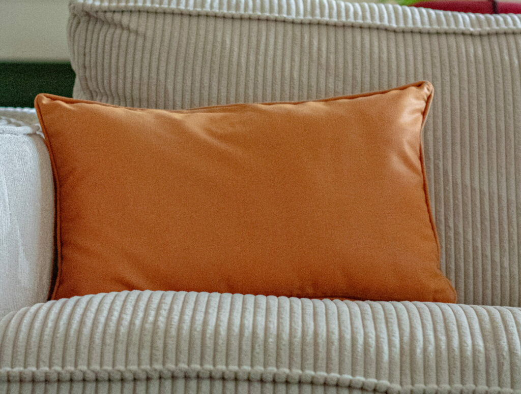 Chez Emmaüs se cachent parfois des pépites insoupçonnées. Ces échantillons de tissus d’ameublement, ornés de petits bouts de variantes chromatiques accrochés comme autant de promesses, en était une. Leurs motifs graphiques évoquent l’esthétique des années passées, où le textile d’ameublement était un art à part entière. Ces tissus offraient suffisamment de matière pour imaginer une seconde vie. Plusieurs coussins sont nés de ces trouvailles, transformant un vestige professionnel en objets décoratifs chaleureux. Ces projet illustrent une philosophie simple : la beauté se trouve partout, même dans les rebuts de l’industrie textile. Des échantillons destinés aux professionnels d’hier deviennent aujourd’hui des éléments de décoration assumés, preuve que le vintage et la récup’ ont toujours une carte à jouer.